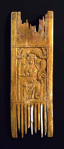 Both combs are decorated in low relief. The narrower, slightly earlier, comb has the personification of Constantinople (wearing a crown representing a city wall, holding a horn of plenty) on one side, while on the other is the personification of Rome, the new and old imperial residences, centres of the eastern and western halves of the late Roman empire, seemingly an unusual theme for a personal object.