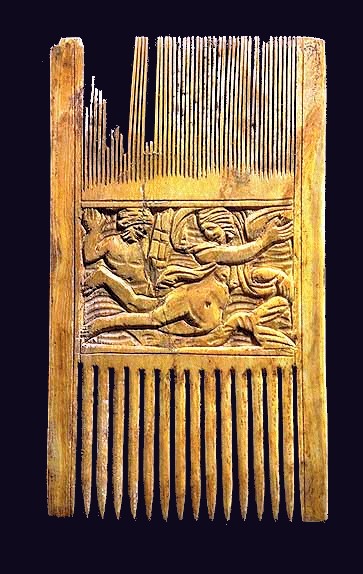 The broader comb shows a Nereid and Triton, both ancient Greek water deities. The more sketchy rendering of the figures help to date the comb to the 6th century AD. Decorative subjects drawn from classical mythology are often found on luxurious personal possessions up until the 8th century AD.